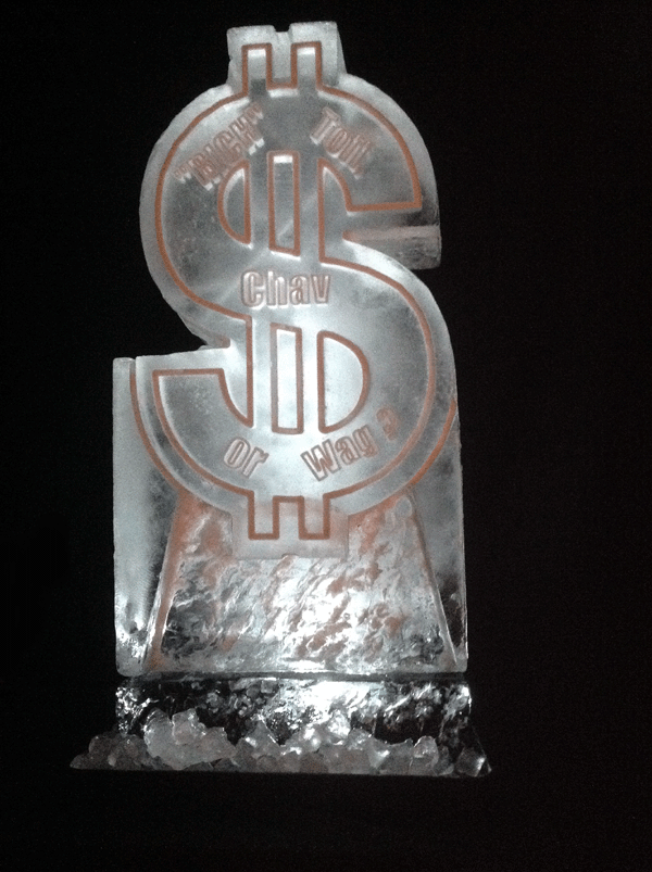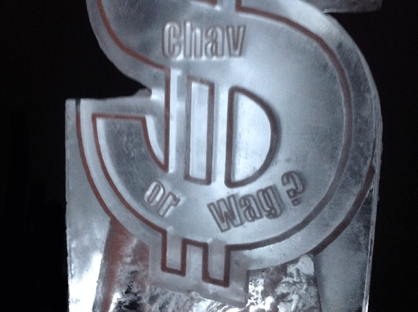 This Luge was for an America themed 40th birthday party in Sevenoaks, Kent. The text we CNC'd into the ice was: "Rich Toffs, Chavs and WAGS".  The whole outline (the sharp lines) was all done on a CNC machine creating a crisp, clear and visually stunning fpiece.