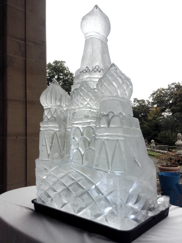 Over the years we have carved many St Basil's Cathedral but always as an ice sculpture; St Basil's Cathedral - 1 , St Basil's Cathedral - 2. Iona wanted it as a Vodka Luge. So St Basil's Cathedral - 3 was conceived as a Vodka Luge. In order to create St Basil's Cathedral - 3 as a luge, we had to make sure there was enough thickness of ice to drill the channel through the ice. This could not be a delicate, intricate and 'thin' Sculpture. It had to be 'chunky' or at least thick ice where we wanted to drill the luge channel. All this needs to be planned and in effect, mapped-out before we start.